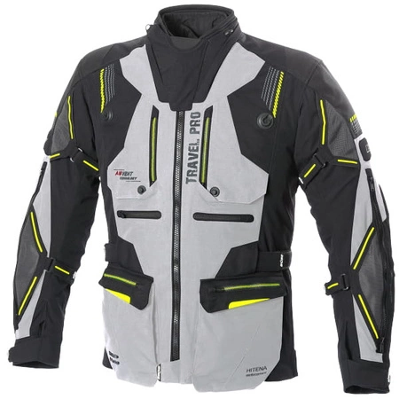 Warstwa zewnętrzna Travel Pro wykonana została z wysokogatunkowej tkaniny poliamidowej, która charakteryzuje się wysoką odpornością na ścieranie. Wraz z protektorami łokci i barków oraz podwójnymi, spełniającymi surową normę ISO 4916, szwami bezpieczeństwa, gwarantuje to nie tylko dobrą ochronę w razie wypadku, ale i długi czas użytkowania kurtki.