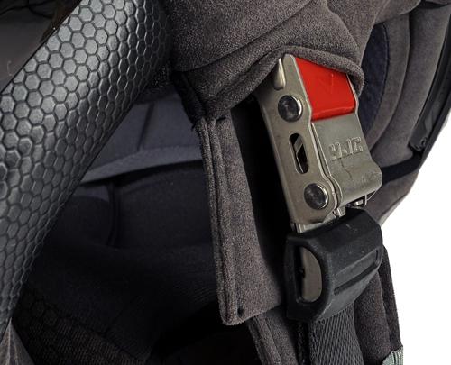 HJC R-PHA-90S został wyposażony w zapięcie micro-buckle wykonane w 100% ze stali nierdzewnej, które zapewnia możliwość błyskawicznego zapięcia i odpięcia kasku.
