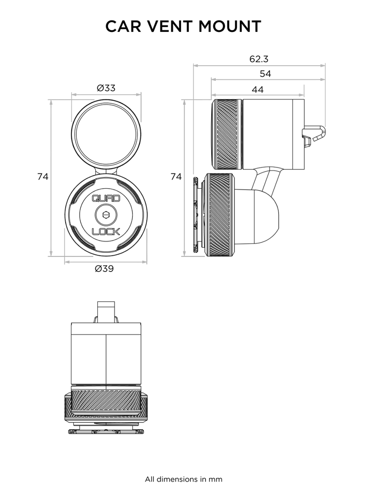 Odpowiedni do użytku ze wszystkimi etui Quad Lock® i uniwersalnymi adapterami, uchwyt Quad Lock montowany w kratkę wentylacyjną to bezpieczny sposób na wygodne przymocowanie telefonu do otworów wentylacyjnych w samochodzie.