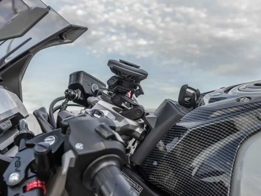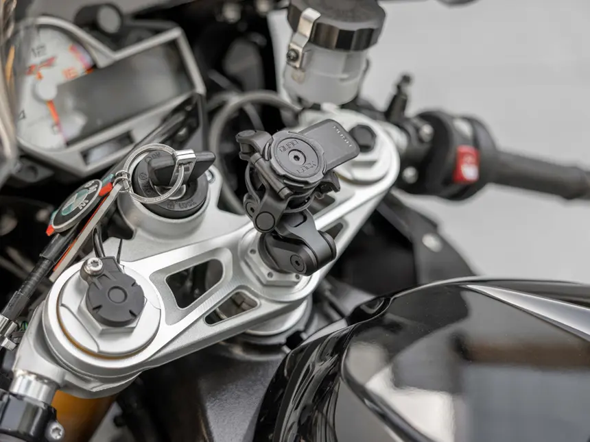 Poziom wibracji niektórych motocykli może wpływać na stabilizację obrazu w nowych smartfonach. Opcjonalny tłumik drgań Quad Lock umożliwia pewny montaż smartfona na dowolnym motocyklu.