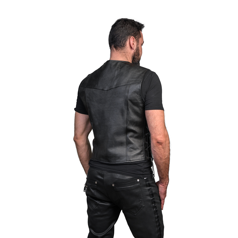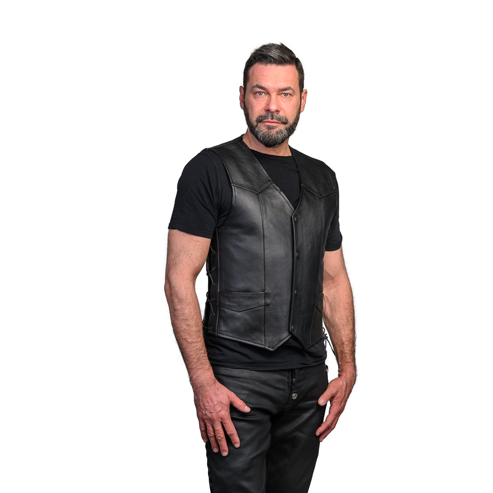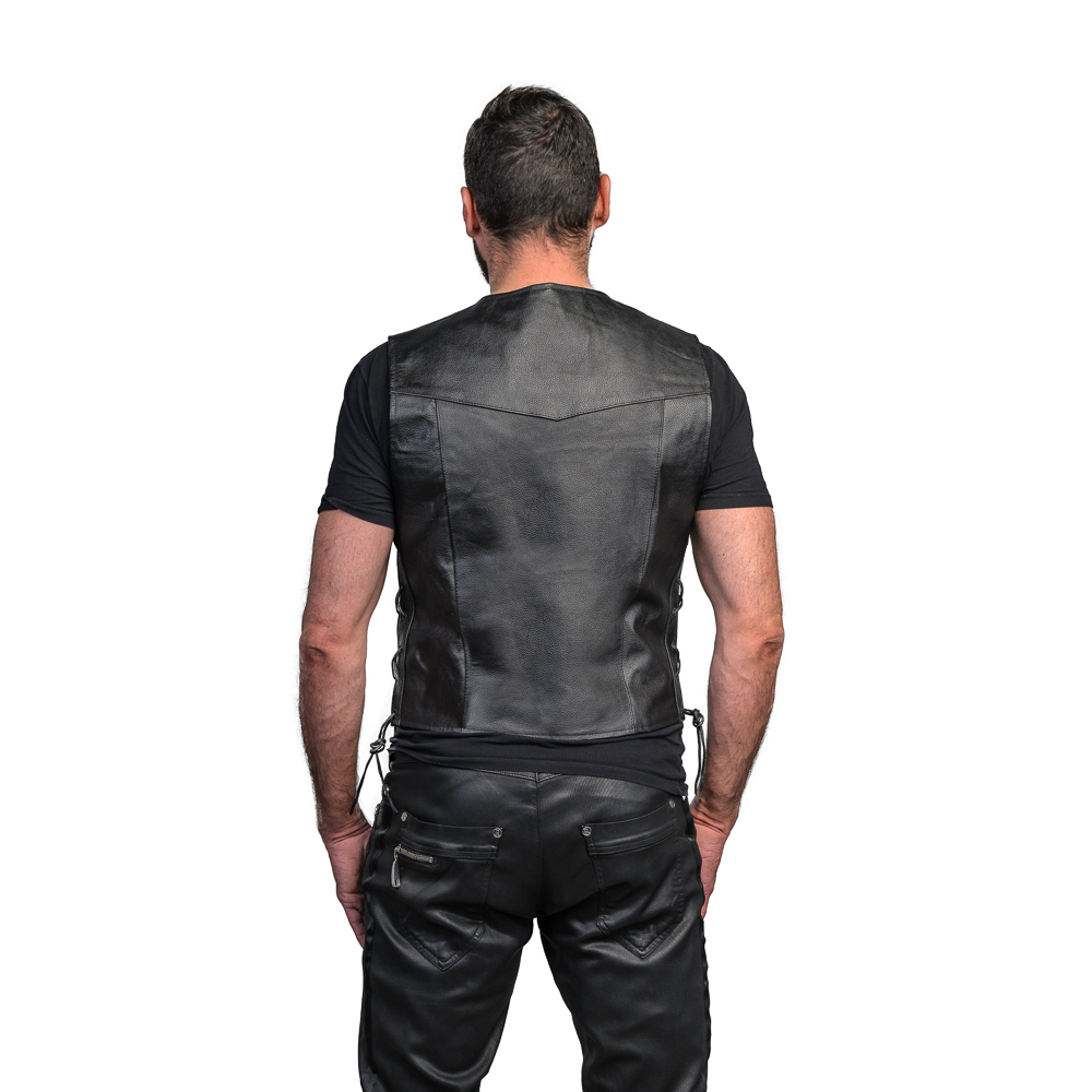Naturalna skóra bydlęca, oryginalny fason z rzemieniami, trzy kieszenie i wytrzymała podpinka z delikatnego, przyjemnego w dotyku materiału, dzięki czemu nie podrażnia gołej klaty i pleców nawet po wydepilowaniu :)